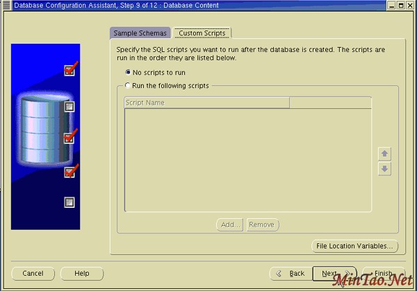 13. 如果需要,在创建数据库以后,指定一个或多个要运行的 SQL 脚本。 否则,接受缺省的 No scripts to run 。单击 Next 。