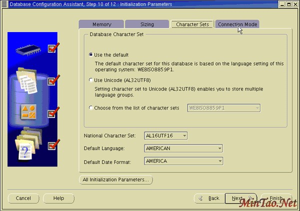 16. 出现 Character Set 页面。 选择您的数据库的字符集。 单击 Connection Mode 选项卡。