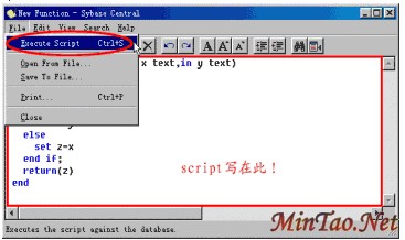 为了以上几行Script,本人也试过多次才成功,首先是上面的(in x text,in y text),表示函数有两个输入参数:x,y,而数据类型是text。这个text数据类型真是很有趣,我想就算是Sybase公司很好的创意吧!刚开始时,我用的是real类型,但它处理数值型字段时可以,但在处理字符型的字段时就不灵了,后来又仔细分析了一下Adaptive Server Anywhere所提供的数据类型后,改用text一切才OK!后面的Script,我曾想直接调用Adaptive Server Anywhere的isnull()函数,却没有成功,欢迎广大网友积极参与讨论;至于其它的Script,大家仔细看看Adaptive Server Anywhere的帮助后,应该是可以写出来的。