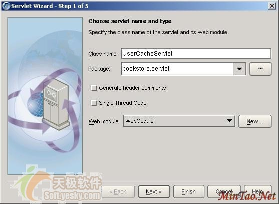 在Class name中填入Servlet的名字:UserCacheServlet,在Package中填入bookstore.servlet作为包名。按Next到下一步。