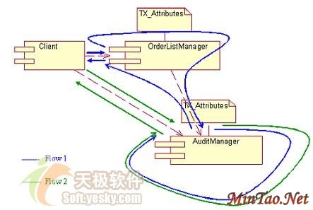 图1显示了两个相互独立的调用关系流。在流1中,如果客户端拥有TX关系,OrderListManager要么参与它,要么启动一个新的TX,这依赖于Client是否在某个TX中,以及为OrderListManager方法提供了什么样的TX属性。OrderListManager服务接下来调用AuditManager方法的时候,这样的解释也是正确的。