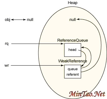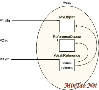 图 1 显示了每行代码执行后各对象的状态。行 //1 创建 MyObject 对象,而行 //2 则创建 ReferenceQueue 对象。行 //3 创建引用其引用对象 MyObject 的 WeakReference 对象,还创建它的 ReferenceQueue。请注意,每个对象引用(obj、rq 及 wr)都是强引用。要利用这些引用类,您必须取消对 MyObject 对象的强引用,方法是将 obj 设置为 null。前面说过,如果不这样做,对象 MyObject 永远都不会被回收,引用类的任何优点都会被削弱。