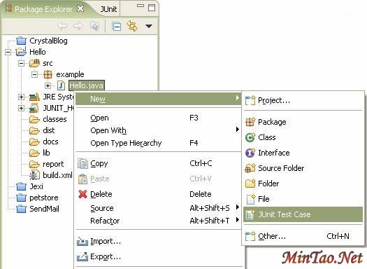 下一步,我们准备对这个方法进行测试,确保功能正常。选中Hello.java,右键点击,选择New->JUnit Test Case: