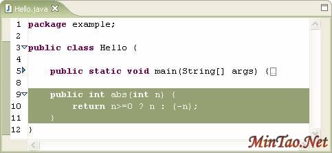我们创建一个Java工程,添加一个example.Hello类,首先我们给Hello类添加一个abs()方法,作用是返回绝对值: