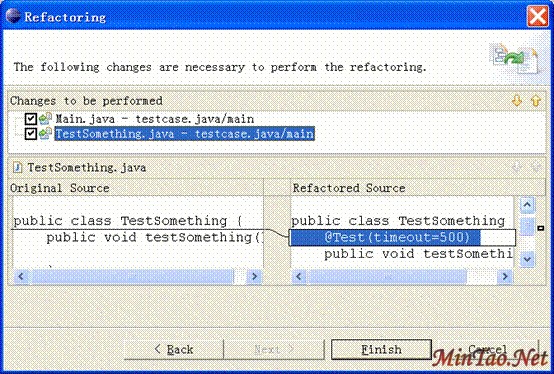 接下来,我们将通过一个例子来展示如何在Eclipse中创建新的重构功能。我们这里创建的重构将用于迁移JUnit的测试用例。我们知道,在当前版本的JUnit中,一个用于测试的函数必须以字符串"test"作为方法名称的开始。而在即将来到的JUnit 4中,一个"@Test"的Annotation被用于标明方法是一个测试方法。我们将要创建的重构将完成这个迁移工作,即在所有的以"test"开始的方法之前加上"@Test"标记。@Test Annotation还可以包含一个timeout属性用来规定方法的最大执行时间,我们在向导中提供了一个页面供用户选择是否需要timeout属性。