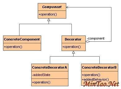 以下是代码片段: public abstract class OutputStream implements Closeable, Flushable { public abstract void write(int b) throws IOException; ... } 它定义了write(int b)的抽象方法。这相当于Decorator模式中的Component类。
