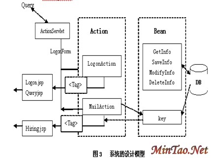 做基于Struts框架的项目开发,关键是要有一个好的整体模型,计划好系统中包括哪几个模块,每个模块各需要什么样的FormBean、JavaBean,各种处理结果都通过哪些JSP页面来展现,同时配置好struts-config.xml文件。本系统的设计模型如图3所示。