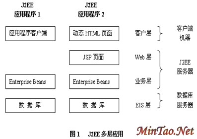 J2EE平台采用一个多层次分布式的应用模式。这意味着应用逻辑根据功能被划分成组件,组成J2EE应用的不同应用组件安装在不同的服务器上,这种划分是根据应用组件属于多层次J2EE环境中的哪一个层次来决定的。如图1所示,J2EE应用可以由三或四个层次组成,J2EE多层次应用一般被认为是三层应用,因为它们是被分布在三个不同的地点:客户端机器、J2EE服务器和数据库或后端的传统系统服务器。三层架构应用是对标准的客户端/服务器应用架构的一种扩展, 即在客户端应用和后台存储之间增加一个多线程应用服务器。