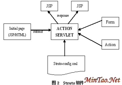 Struts 框架就是基于Model 2 的架构,也就是基于MVC模式的框架技术。它是一个免费的开源的WEB层的应用框架,具有很高的可配置性,和有一个不断增长的特性列表。一个前端控制组件,一系列动作类,动作映射,处理XML的实用工具类,服务器端java bean 的自动填充,支持验证的WEB 表单,国际化支持,生成HTML,实现表现逻辑和模板组成了struts的灵魂。图2显示了Struts组件是如何一起工作的。
