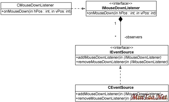 图 2 所示的类图给出了一个示例场景。CEventSource 类用 C++ 语言编写。它使用 addMouseDownListener() 和 removeMouseDownListener() 让侦听器注册和取消注册其 “鼠标按下” 事件。它想要所有侦听器实现 IMouseDownListener 接口。