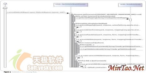 TilesRequestProcessor中的校验过程将调用所有基于Struts校验框架的校验并且把action错误保存到请求中。我们需要把action错误分析成片断并生成将被发送到客户端的XML消息校验。既然我们想改变校验方式,那么在校验过程中,我们应该检查我们使用的是哪一种校验框架(见图3)。