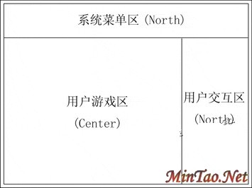 在对这几个布局管理系统有了基本认识后,我们就一起来进入界面设计吧。在仔细观察了QQ游戏中“连连看”的设定后,我们可以发现,整个界面分为三个区,顶部是系统菜单区,占地面积最大的是用户游戏区,另外还有一个用户交互区,每个区域中都由若干控件组成。 这么多控件,我们从哪开始入手呢?由于容器控件中可以放置其他控件,因此,我们只需要先确定放置的容器控件就可以了。 既然已经知道需要使用容器控件的个数,接下来让我们就进入布局管理系统的选择。用GridLayout?似乎有点勉强,用FlowLayout?还有更好的选择吗?对了,我想你一定想到了是BorderLayout吧,如下图2所示。
