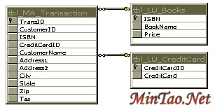 注意:在上图数据库结构中,ISBN是做为表tbl_MA_Transaction与tbl_LU_Books的联系关键字,CreditCardID是做为表tbl_MA_Transaction与tbl_LU_CreditCard的联系关键字。