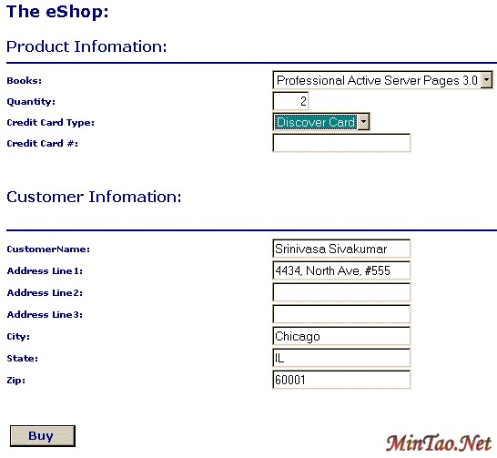 在eShop的例子中,用户将选择书籍、数量和信用卡的类型,并输入信用卡号码和邮寄地址。这个应用程序执行3层结构。下面用VB创建一个基于商业层次的组件。