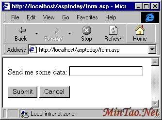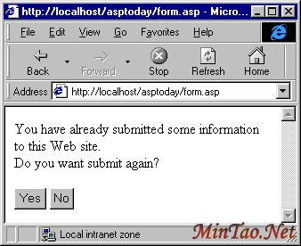 表单包含两个按钮((Yes 和 No) 以及一个隐含控制域(answer) ,在其中保存用户所选择的值: Y 或 N。这个值由JavaScript 函数SendAnswer() 设置,这个函数还将它发送给CheckAnswer.asp 页以执行正确的重定向。如果用户选择了No按钮,CheckAnswer.asp 检验隐含控制的值,并将其重定向到一个普通 welcome 页,反之就将session 变量submitted设置为False 并再次将其重定向到表单页。