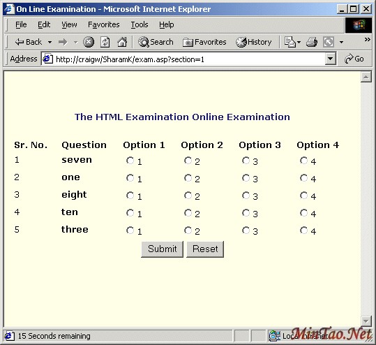 Exam.asp 提供一系列的题目和以单选按钮为格式的选项。为了使测验更具挑战性,还要有时间限制。我设置了一个装载时自动启动的时钟,将其时间设为20秒。剩余的时间在屏幕底部的状态窗口中显示。时间因素同题目个数一样可以改变。为了在每次会员想要参加考试时,都从数据库中选择不同的题目,我使用了随机函数。在数据库中,题目的个数固定为10个,每次会员回答5个问题。所有的题目都一起显示出来,然后开始计时。以下代码是计时器的函数: