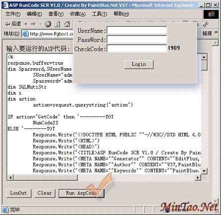 演示(admin 密码admin): www.paintblue.net/myasp/runasp.asp (实际执行功能已经屏蔽,请下载或粘贴下面代码测试使用):