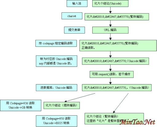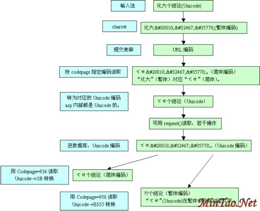 服务器端:IIS解开表单编码--按codepage指定编码读取--转换到对应的Unicode--可以用request("")读取了--进行一些处理--以Unicode编码保存到数据库