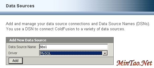 3、打开ColdfusionMX 管理页面,进Data & Services 里面的Data Sources,在Add New Data Source里面填上数据源名称,驱动选择MySQL,点击"Add"进入下一步。