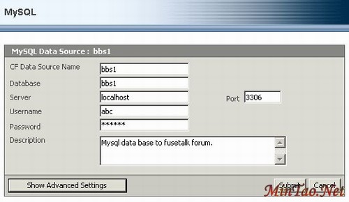 在里面填上相应的数据源,用户名,密码,例如: <cfset ds="bbs2"> <cfset dsusername="sa"> <cfset dspassword="xxxxxx">