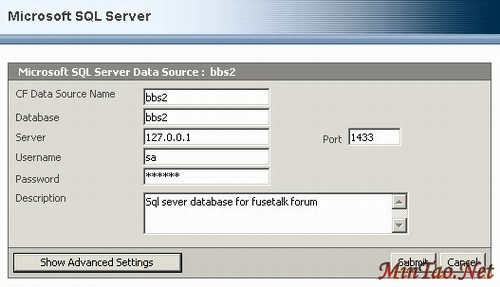 4、打开ColdfusionMX 管理页面,进行数据库配置,类型选择Microsoft SQL Sever。点击Add进入配置界面,输入相应数据,其中Server为数据库服务器IP,本地调试可以用127.0.0.1,Username为sa,密码参看第3步。填完以后点“Submit”,数据库就安装成功了。