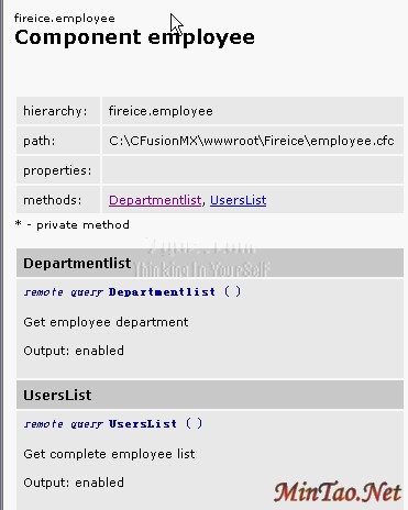 - 为了保险,运行一下这个employee.cfc看看,打开http://localhost:8500/Fireice/employee.cfc。如果没有什么错误的话,应该是下面的图示: