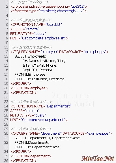 - 接下来向employee.cfc中加入操作雇员的2个方法。注意,这两个方法的访问属性都是remote,是允许远程请求的方法。两个方法返回的值全部都是Query查询的数据集合。所以,<cfreturn>的值和<cfquery>的name属性的值一致。代码如下图。