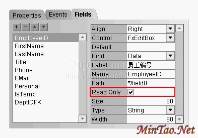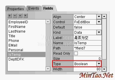 - 切换到Fields(数据集DataSet字段设定)面板,按照我们cfc中employee的query查询的字段来对应设定这里的内容。设定的字段包括EmployeeID,FirstName,LastName,Title,IsTemp,EMail,Phone,DeptIDFK,Personal。其中EmployeeID的Read Only应该选中,因为它是数据表的主键。另外,IsTemp的Type类型选成Boolean的值,只有0和1两个值。 设定的情况如下图所示。