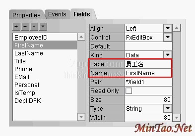 - 除了EmployeeID和IsTemp两个字段以外,其他字段都类似下图设定,我们需要手动修改的只有Label和Name属性。其他都使用flash自动填入的属性值。