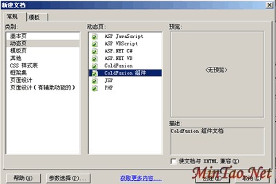这个教程分二个部分:1 创建CF组件2创建flash应用.在开始之前请新建一个站点.一 创建CF组件:这里我们创建一个组件 定义二个函数[chaxun1,chaxun2],函数使用exampleapps 数据库源,返回一个查询结果对象, flash电影文件调用组件方法和接收返回的查询结果.chaxun1函数需要三个参数,这些参数从flash电影中传递过来.(参数为xing ming cheng) 创建的步奏如下所示: 使用dwmx(Dreamweaver MX的简称,下同), 文件→新建: 新建文档对话框,常规卡,动态页,选择ColdFusion组件.[如图]