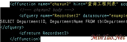 将文档切换到代码视图,剪切 Recordset1[<cfquery >...</cfquery >] 到 查询1的<!--- chaxun1 body --->后粘贴,用同样的方法Recordset2 到查询2. 然后设置<cfreturn > 查询1 设置为<cfreturn Recordset1>