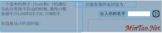 使用前准备: 你需要准备一下的测试环境flash mx ColdFusionMX 源文件下载: 开始下载 10.1k 本文介绍ColdFusion和flash的通信方式,这次不使用Remoting组件,直接使用NetConnection对象,连接到ColdFusion的内置Remoting服务.该服务采用AMF结构的消息机制(动作消息格式). 请大家先温习一下NetConnection对象的方法和属性事件.new NetConnection()新建一个网络连接,connect方法用于连接到一个网络如果是rtmp协议则连接成功返回true,否则返回false,对于http的连接始终返回true.要判断连接是否成功,还可以使用onStatus事件. close用于关闭连接. call用于调用一个服务,联机对象.call("服务",接收对象,参数列表,...) 现在: 打开flashmx新建文档 大小550*150 背景为淡青色.加为静态文字标签3个,动态文本框一个,输入文本框一个,打开共享库托入一个按钮::如下图所示:(为以上控件加入内容)