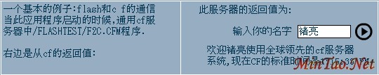 服务器代码编写: 新建站点:flashtest 新建文件f2c.cfm 代码如下 保存位置/flashtest/f2c.cfm <!--- 返回服务器的当前时间---> <cfset theTime = timeFormat(now(), "h:mm:ss tt") > <!--- 特定的变量名 Flash.result可以回调客户端的.onresult ---> <!--- 设定result的数据内容,#Flash.sj# 取得flash传递过来的实名数据变量.否则使用flash.params[1]获得变量,cf中数组从一开始,第一个参数为params[1] ---> <cfset flash.result = "欢迎" & #Flash.sj# & "使用全球领先的cf服务器系统,现在CF的标准时间是" & theTime>