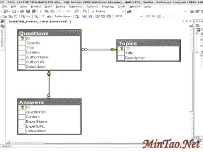对于 DotNetKB 应用程序,我们需要将数据存储在三张表中:主题、问题和回答(请参阅下图)。