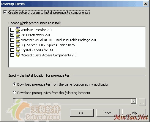 接着,我们在"install mode and setting"选项组中,可以点选"Prerequisites..."按钮,这里可以设置要运行该应用程序时,需要额外安装的库文件或其他必须的文件,如下图所示。默认必须安装的是.net framework 2.0。