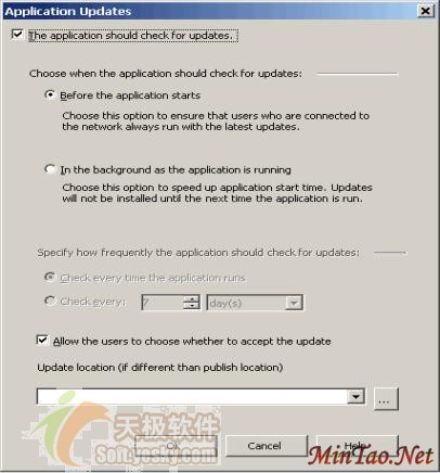 其中,默认是采用启动应用程序时检查更新的选项的。当然,你也可以选择,是在应用程序连接上网时自动检查是否有更新的版本,或者是选择当应用程序启动后,以后台进程的方式,自动检查是否有新的版本。