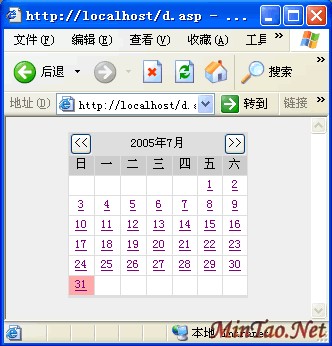 bsp; if i>nunmonthstart and i<=nunmonthend+nunmonthstart then 60 '如果为显示的是今天则用红色背景显示 61 if iv=Day(now) and month(now)=pmonth and year(now)=pyear then 62 response.write( "<td align=center bgcolor=ffaaaa><a href='#' target=_blank>" & iv & "</a></td>") 63 else 64 response.write( "<td align=center><a href='#' target=_blank>" & iv & "</a></td>") 65 end if 66 else 67 response.write( "<td> </td>") 68 end if 69 70 '如果能被7整除(每行显示7个)则输出一个换行 71 if i mod 7=0 then 72 response.write( "</tr><tr align=center bgcolor=ffffff height=19>") 73 end if 74 i=i+1 75 loop 76%> 77</table> 78</body>