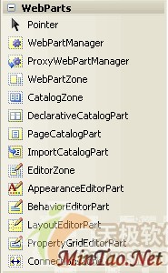 首先,在vs.net 2005 中的工具箱中,可以找到如下图所示的webpart系列控件,有很多个,限于篇幅,本文介绍其中的一些重要的控件: