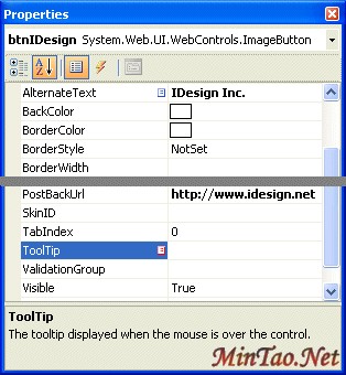 再切换回视图状态可以看到一些属性右边有红色标记,这表明这个属性绑定的是本地资源,通常这些都是IDE自动为你做的,再看看上面的AlternateText后面有一个蓝色标记,这表示这个资源是全局的资源