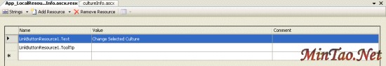 上图显示了,不仅ASPX文件,用户控件和MASTER页都会自动产生资源文件,自动产生的资源文件名将是原文件名加上.resx,页面上的所有服务器控件,用户控件和在服务器端运行的HTML控件都会被自动加在资源文件中,下图显示了一个LINKBUTTON的资源文件