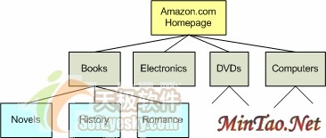 任何由多个页面组成的网站都需要某种导航用户接口。一个导航用户接口可能象一些该站点中的到另外一些页面的静态超级链接一样得简单,或者可能包含菜单或树形控件的使用。但是,在为该站点创建一个导航用户接口之前,首先必须定义站点的逻辑结构。(这个逻辑结构常常被参照为一个站点地图。)例如,一个象Amazon.com这样的网站被组织成各个部分-其中包括产品栏如电子学书,计算机书,DVD等等。其中的每个还可能含有子部分。书目按类型划分,象CD,小说,历史书,浪漫书类,等等。典型地,这些逻辑结构形成一个分类层次。在下面的屏幕快照显示出Amazon.com的站点地图的缩略版本。