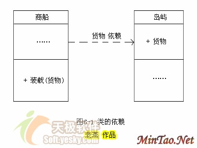 但类的单独存在没有任何意义!最普通的关系是某个类的实例使用另一个类的实例,如果商船泰坦尼克号需要夏威夷岛提供货物,那么我们称商船依赖(Dependency)于岛屿提供货物,如图1所示,而随之而来的问题是,如果夏威夷岛内部动乱(类的实现者修改public成员接口),将直接影响泰坦尼克号的正常工作,我们也将不得不重新组织商船类的内部结构以适应变化,前功尽弃。耦合是类间依赖程度的量度,对于变化可能性大的类在处理依赖关系时要尽量避免高耦合。