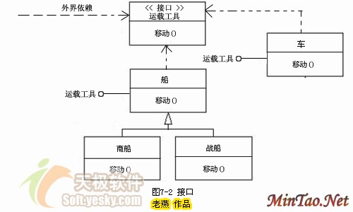 OO思想一般强调类为主角,方法是类的配角,尤其抽象类系,基类与所有子类是强耦合关系,它要是倒下了,人心就散了,队伍就难带了。一旦抽象类需要变动(增删改类系的公共方法),就对一个软件架构的影响程度而言,不亚于俄罗斯对乌克兰天然气涨价给欧洲带来的振憾,有可能带来多米诺骨牌效应。 当方法不仅仅只是一个而是多个类系的公共行为的抽象时,我们就必须把配角方法升格为主角,让它来支配相关类系,做法是将公共方法接口独立出来,单独定义成接口(interface),然后由相关类系一一实现,这时我们可以把其称为方法的类。所有外界与其关系不再建立在抽象类而是建立在接口之上,如图7-2。在定义接口的时候,注意不要让其过度臃肿,一个类对另外一个类的依赖性应当是建立在最小接口上。复杂的接口可以通过接口的多重继承或委托来分离。