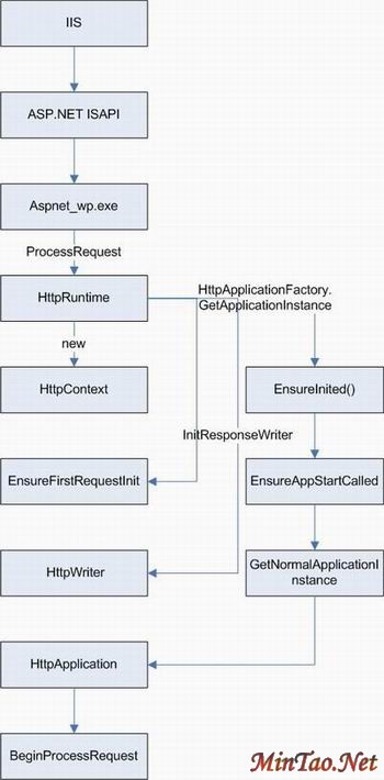 aspnet_wp.exe的主要任务是将请求交给一系列称为的 HTTP 管道的托管对象。如果把ASP.NET ISAPI比做销售经理,那aspnet_wp.exe就是生产经理,而HTTP 管道就是生产的流水线。负责流水线的小组就是HttpRuntime,生产经理aspnet_wp.exe会将订单(HTTP请求)交给HttpRuntime小组的工作人员ProcessRequest(HttpWorkerRequest wr),HttpRuntime根据内部的分工,最终由ProcessRequestInternal(HttpWorkerRequest wr)在流水线上进行生产,所以ProcessRequestInternal(HttpWorkerRequest wr)是我们分析的重点。