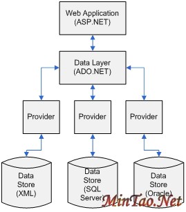 数据访问涉及四个主要的组件:Web 应用程序 (ASP.NET)、数据层 (ADO.NET)、数据提供程序,以及真正的数据源。这些组件之间的关系构成了所有数据识别 Web 应用程序的基础结构。