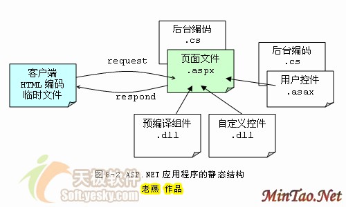 在ASP.NET架构中,服务器端的ASP.NET页面对应客户端的HTML页面,包含一个交互Web Form,继承于FrameWork的Page类。ASPX文件是人,HTML编码临时文件是影,人动则影动,两者合成完整意义上的用户界面。用户对影进行各种操作,系统通过人进行相应处理,"request-response"回馈机制完成两者的映像过程,如图8-2。
