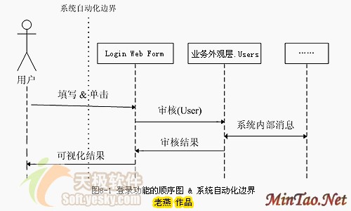 在系统设计中,需要划分自动化系统边界,即把系统划分成手工操作和系统自动两个部份,两者通过用户界面(User Interface)完成对接,如图8-1。用户界面完成系统的输入输出工作:收集用户触发事件及相关数据,传递给系统内部进行处理并接收处理结果,可视化处理结果。在企业级的c/s应用中,aspx及其后台编码文件功能单纯得只剩下一个--完成人机交互。一个漂亮的网页不是用户界面设计的全部内涵,它更应该象一位面容姣好、语音甜美的接待者,轻声细语地询问用户需求,聆听用户杂乱无章的诉说,耐心指导用户完成操作流程,宽容用户错误,准确为用户送上最终结果--"您的账户里只剩0.4元,无法完成支付操作。"总之一句话,要充分认识和领会白居易同志写诗的伟大精神,让50出头的妈妈愉快地完成人机交互。