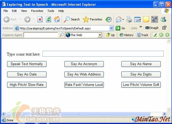 图2.示例应用程序-你可以使用这个程序来听一下以多种方式说出的文本。 该多模态应用程序使用一提示控件来指定将被播放给用户的音频。该提示控件包含InlineContent属性——它可以包含一个或者是Content型或者是Value型的基本Speech控件。该Content控件指定一特定的包含存储的音频记录的提示文件。该Value控件指定一个HTML Web页面中的元素。该示例应用程序使用一Value控件——它参考一个名为txtText的输入元素(在图2中的"Type some text here:"域)。下面是描述了用于一个提示的标注的HTML: