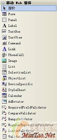 Visual Studio 2005提供了一组功能强大且友好的开发工具来创建移动WEB程序,如果你已经有创建传统的ASP.NET应用程序的经验,那么你就会发现创建移动WEB程序和创建传统的ASP.NET应用程序是非常类似的。你只需要创建一个ASP.NET网站项目并添加一些移动WEB窗体即可。当你添加移动WEB窗体后,你就会发现在工具箱中添加了如下图所示的ASP.NET移动控件。