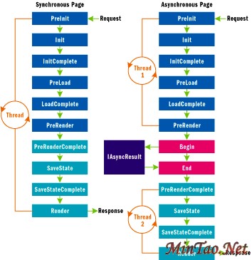 (Asp.net 1.0一般处理过程) (使用Asp.net 2.0新增特性异步页功能处理过程) 从左图中看出,在一个页面整个请求的过程中, 一个线程始终为同一个页面的请求服务.